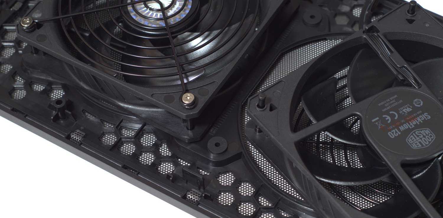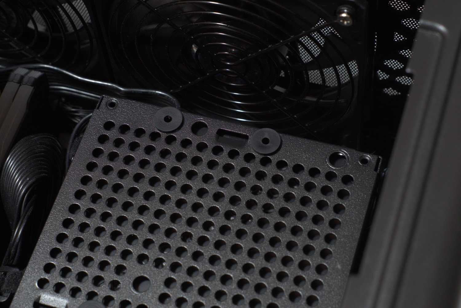 Сразу же на верхнюю крышку можно установить комплектные 120 мм вентиляторы. Фиксируются они легко – нажатием вниз, а силиконовые вставки обеспечат дополнительно гашение вибраций, передаваемых вентиляторами. Хорошо, что вентиляторы имеют защитную решетку, таким образом минимизируется риск попадания кабелей в лопасти.