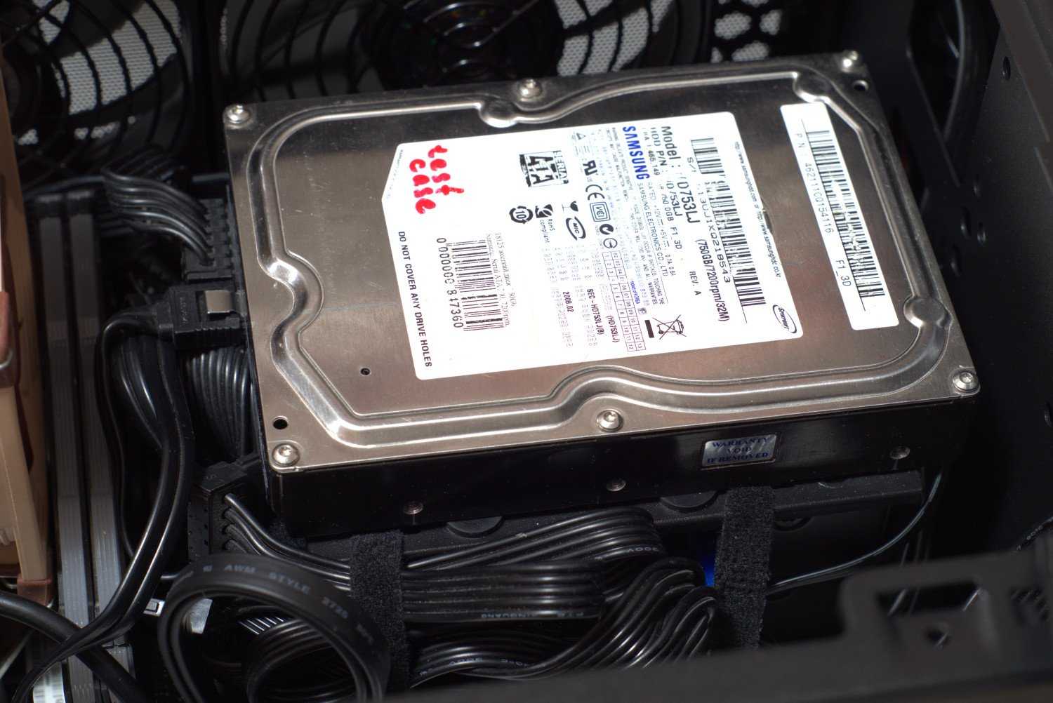 Подготавливаем жесткий диск для монтажа. Вкручиваем в него специальные винты и ставим в пазы кожуха блока питания. Расположение рядом с вентиляторами позволяет говорить о неплохом охлаждении. Посмотрим, что будет на практике.