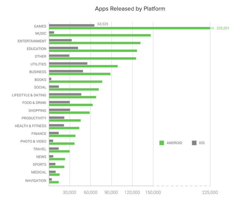 В 2020 году Liftoff выпустили отчет о трендах на рынке мобильных приложений и также сделали вывод, что паблишеры на Android были гораздо активнее, чем на iOS. Так, согласно их отчету, в 2020 году на Android выходило в три раза больше приложений, чем на iOS.