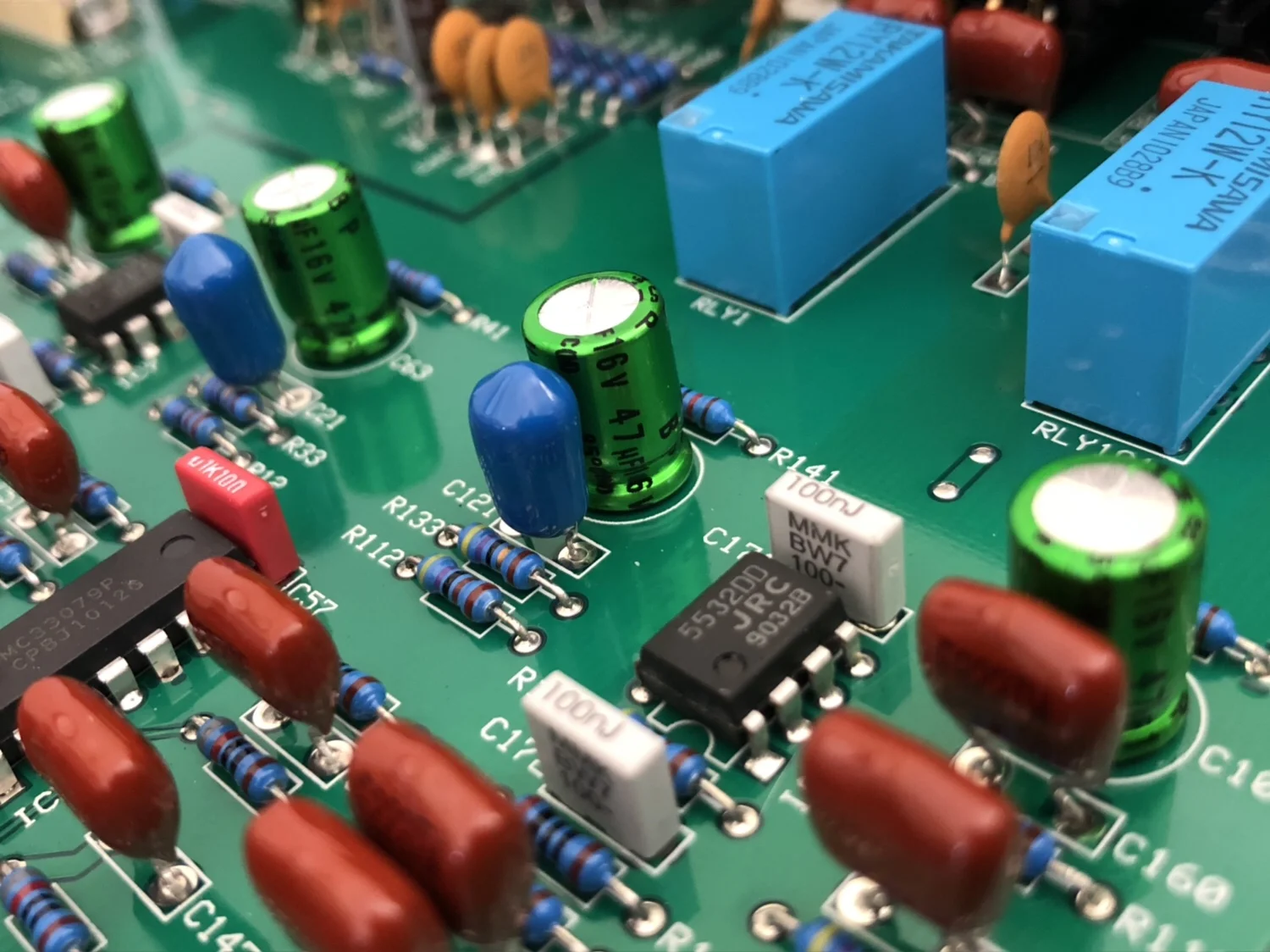 The low-quality output coupling capacitors had to go. I’ve replaced them with these green Nichicon MUSE bipolar caps. I’ve further improved them with WIMA polypropylene film bypass capacitors, under the board for the best performance.