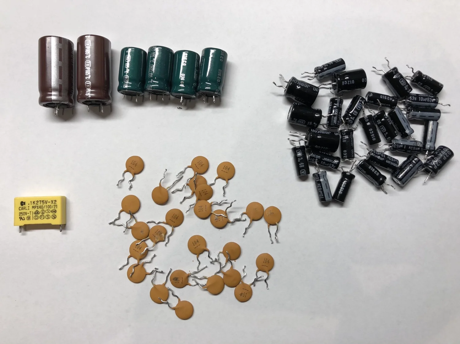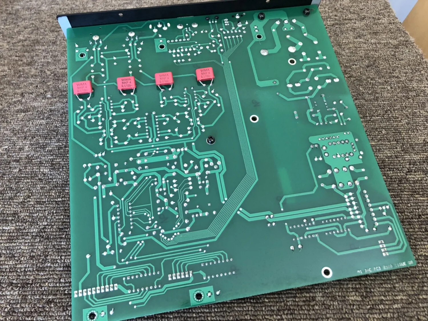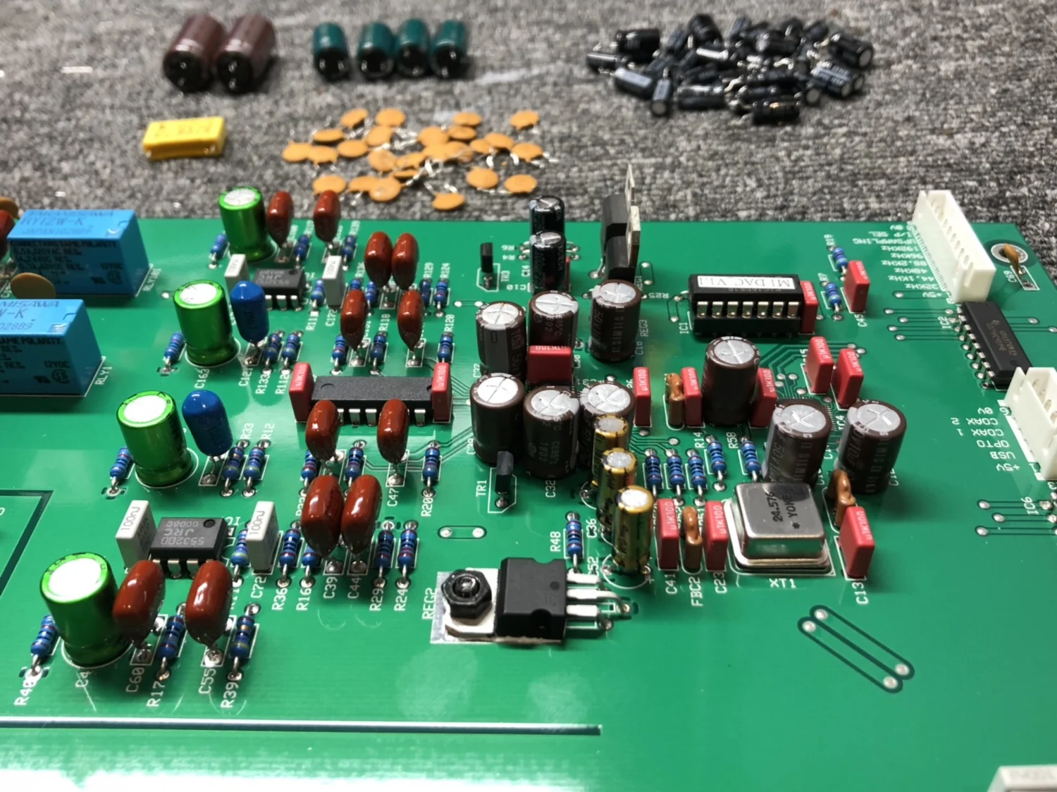 The 60 or so parts I’ve replaced in this M1 DAC. I’ve also added a few more not visible here. The yellow mains suppression X2 cap was completely dead. I replaced it with a premium Kemet part.