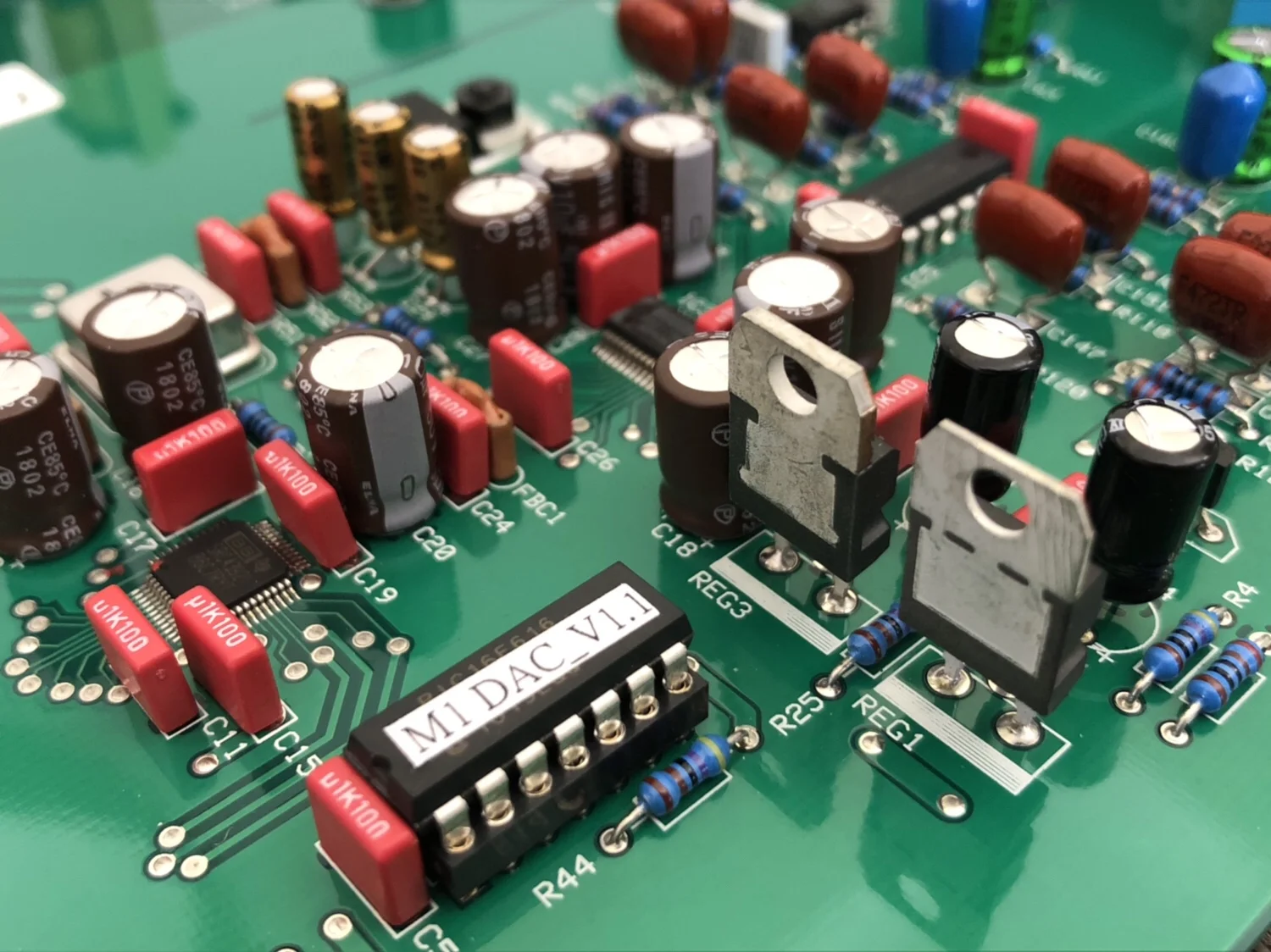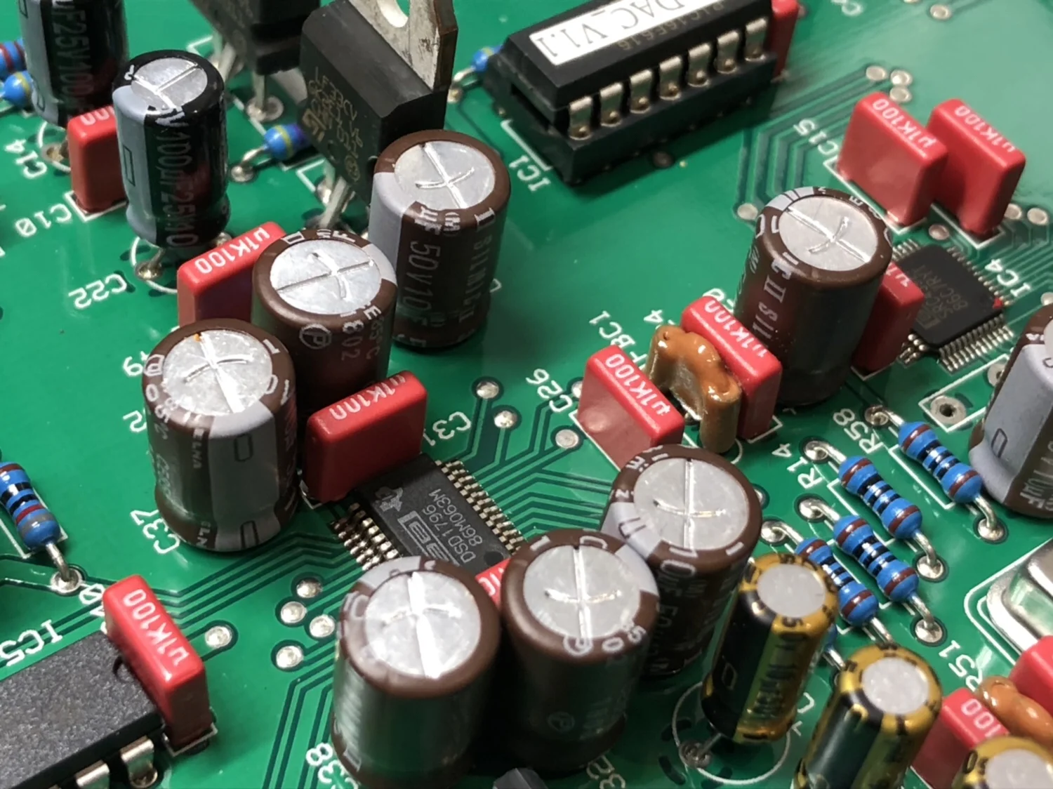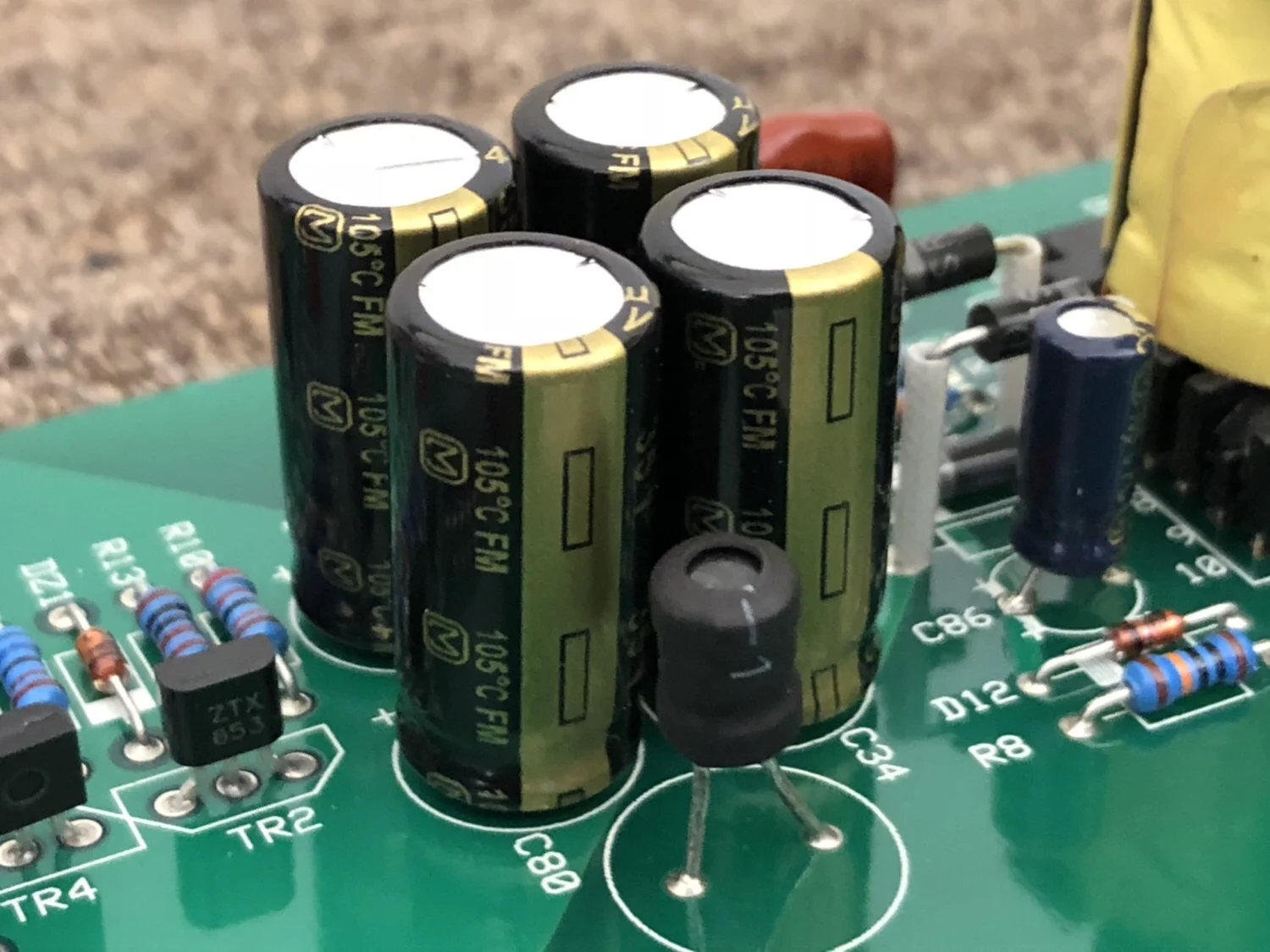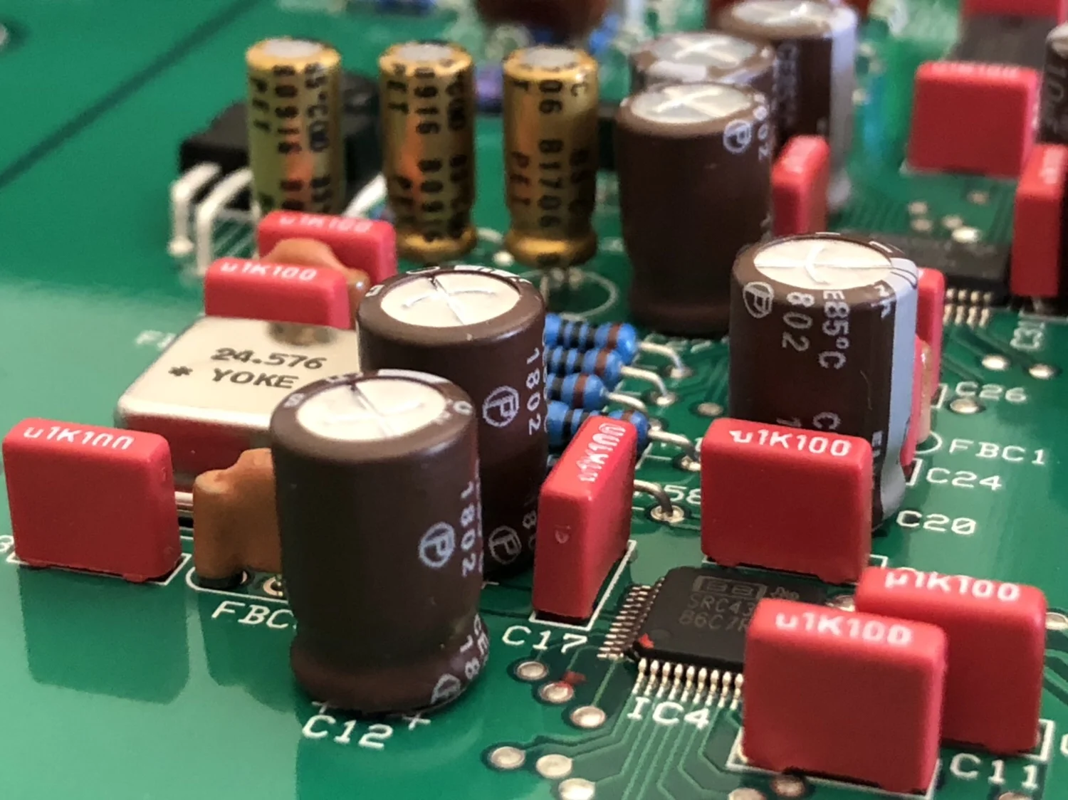 The 60 or so parts I’ve replaced in this M1 DAC. I’ve also added a few more not visible here. The yellow mains suppression X2 cap was completely dead. I replaced it with a premium Kemet part.