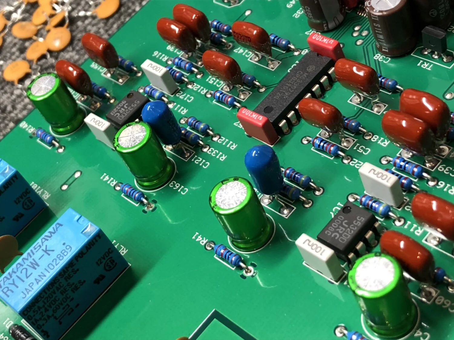 Another shot of those pretty MUSE bipolar audio grade capacitors. Note the cream ERO rail decoupling caps around each JRC5532DD op-amp. The 5532 has been around a long time but is a technically excellent op-amp.