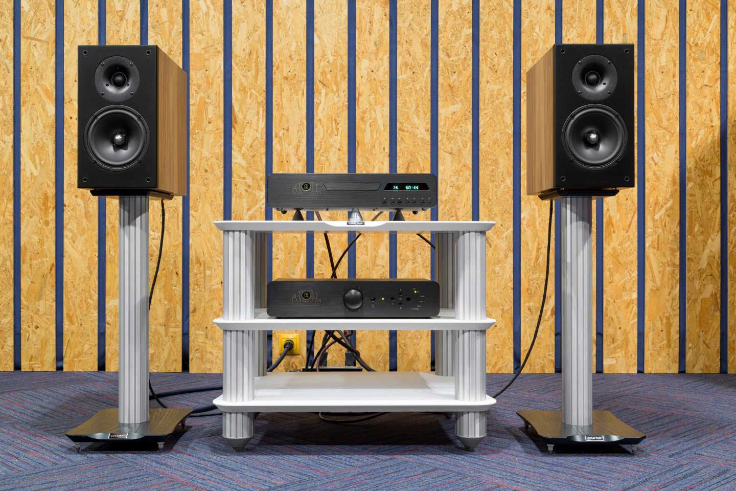Акустические системы обладают далеко не самой рекордной чувствительностью, поэтому в качестве компонентов в систему поставили усилитель Atoll IN 100 (мощность 100 Вт при нагрузке 8 Ом), а источником послужил проигрыватель компакт-дисков Atoll CD 100SE-2. Вся коммутация была выполнена на кабелях Cold Ray, и даже стойка была этой же фирмы.