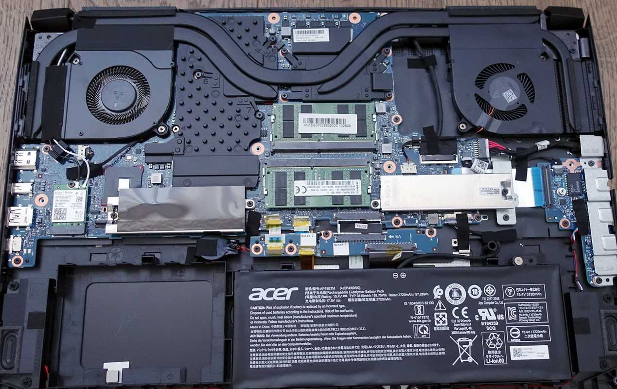 Объемный корпус ноутбука позволил разместить сразу 2 слота под SSD-диски формата M.2 (можно собрать аппаратный RAID0), а также обычный SATA-слот с коробкой под HDD 2.5′.
