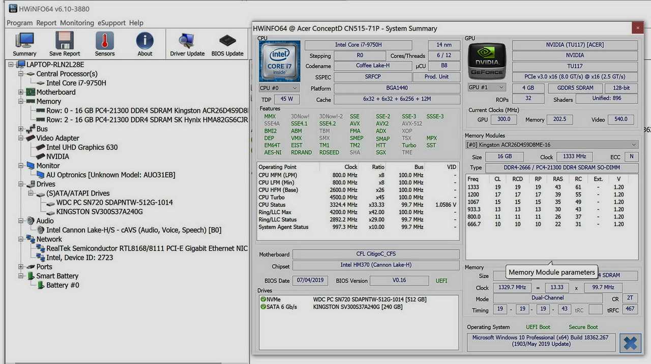 Портативный компьютер может быть мощным. В нашем Acer ConceptD 5 Pro CN515-71P используется процессор Core i7-9750H (Coffee Lake-R), 32 ГБ оперативной памяти DDR4 2666 МГц, уникальная для ноутбуков видеокарта и очень быстрый NVMe-накопитель.