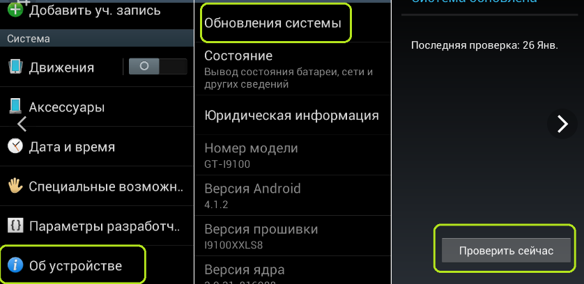 - Выбрать «Об устройстве», а потом «Обновление системы» и «Проверить сейчас».