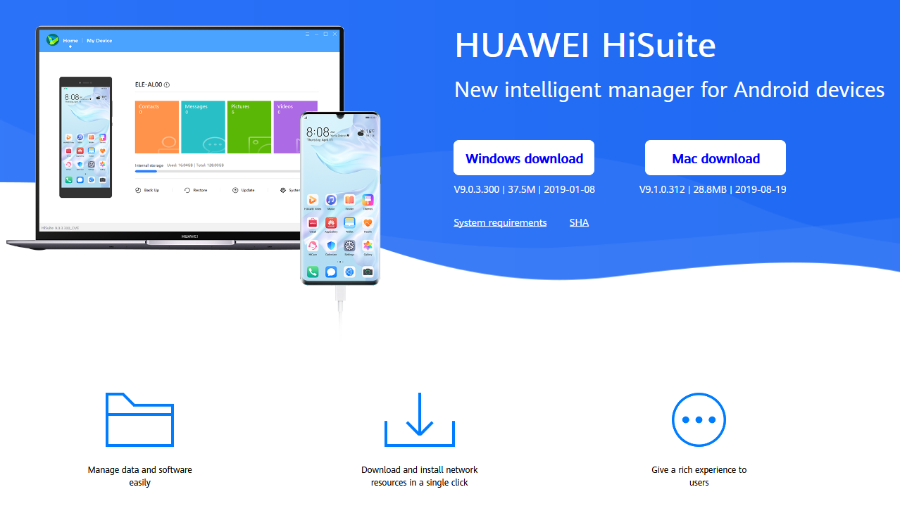 - Перейти по этому адресу: consumer.huawei.com/minisite/HiSuite_en/. Выполнить скачивание инсталлятора. Естественно, на жесткий диск персонального компьютера, а не в память мобильного телефона. Запустить установку, подождать ее завершения;