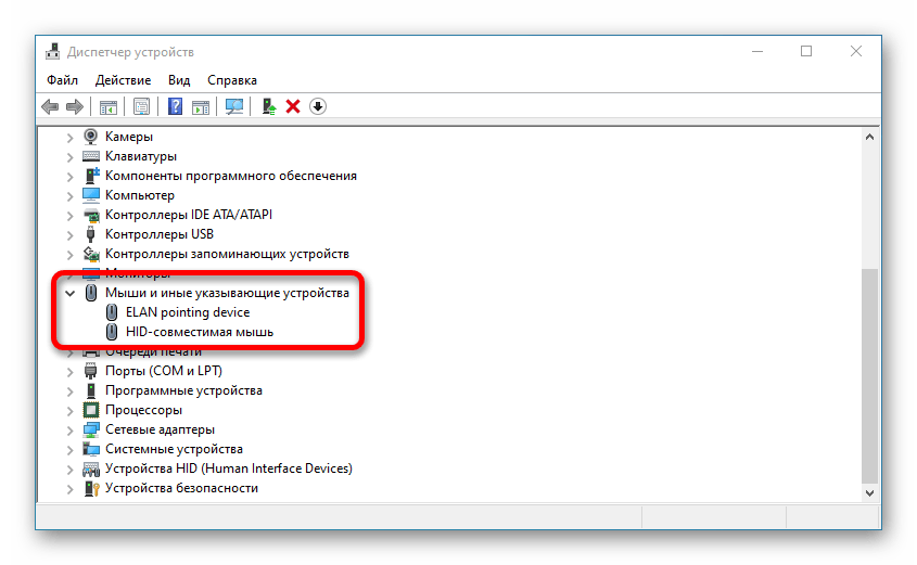 В открывшемся «Диспетчере устройств» задействуйте клавишу Tab, чтобы переместить выделение в рабочее пространство. Воспользовавшись стрелками ↑ и ↓, перейдите на ветку «Мыши и иные указывающие устройства». Нажмите →, чтобы развернуть выпадающий список, выберите наименования мышки и воспользуйтесь клавишей Enter.