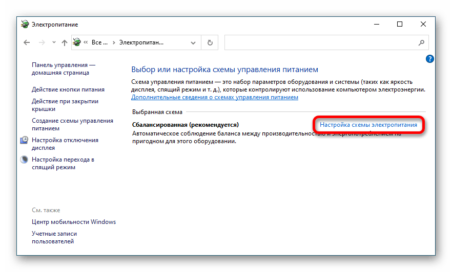 Переместив с помощью Tab выделение в основную часть окна, выберите ссылку «Настройка схемы электропитания» и нажмите Enter.