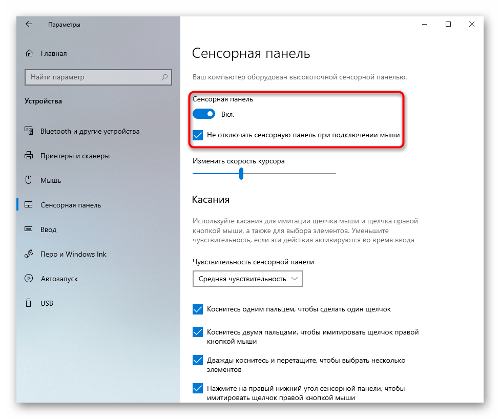 Обратите внимание и на наличие параметра «Не отключать сенсорную панель при подключении мыши». Если вы пользуетесь тачпадом и мышью попеременно, вместо того, чтобы самостоятельно управлять работой тачпада, каждый раз отключая и включая его вручную, просто снимите галочку с данного пункта