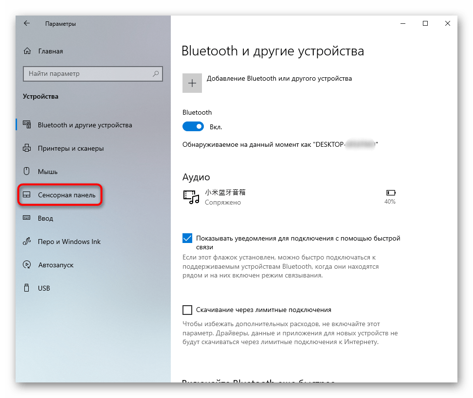 В блоке слева найдите строку «Сенсорная панель» и кликните по ней.