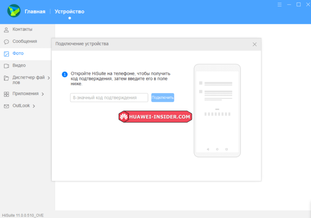 - Далее, в открывшейся на компьютере программе HiSuite следует ввести 8-значный код, который в этот момент появится на экране смартфона.