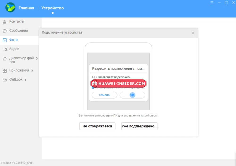 - убедиться в HiSuite, что гаджет распознан и подключен;