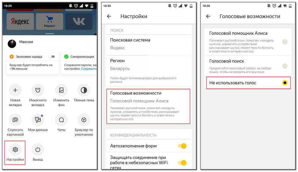 Шаг 2. В открывшейся странице найдите раздел «Голосовые возможности». Здесь выберите для помощника нужные параметры (например, чтобы Алиса не включалась без нажатия кнопки). Выберите «Не использовать голос», чтобы полностью отключить голосовые возможности.