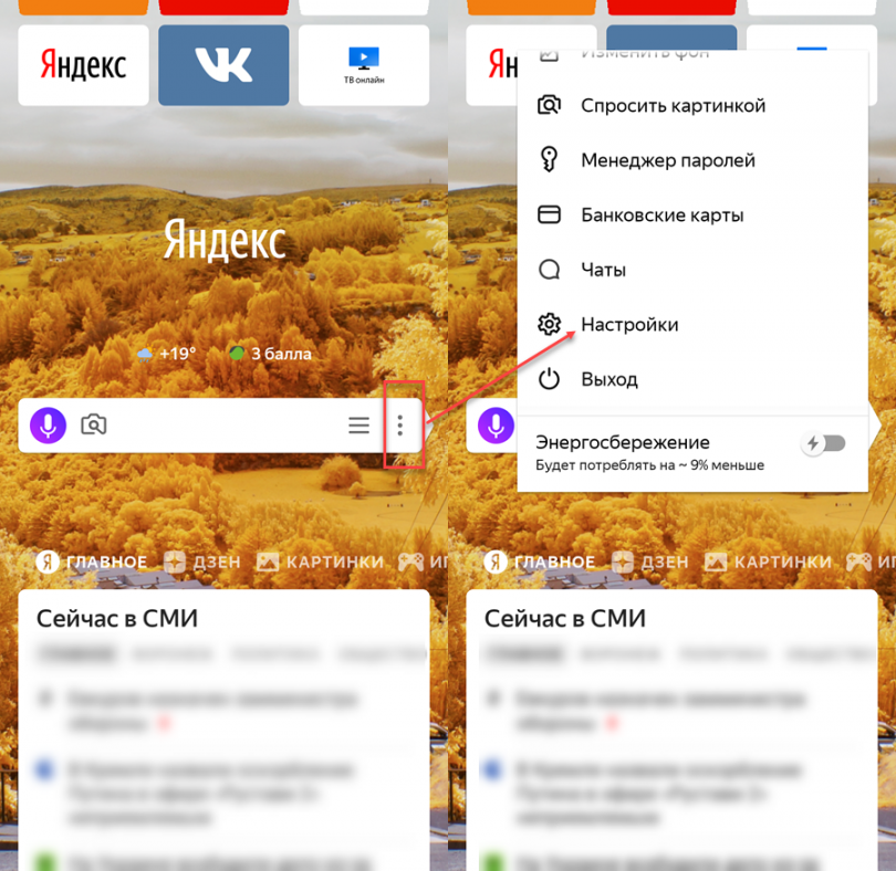 Шаг 3. Запустите Яндекс — с Алисой. На главной странице вызовите меню. Для этого сделайте свайп вправо или нажмите на значок в виде трех полосок. Здесь нажмите «Настройки».