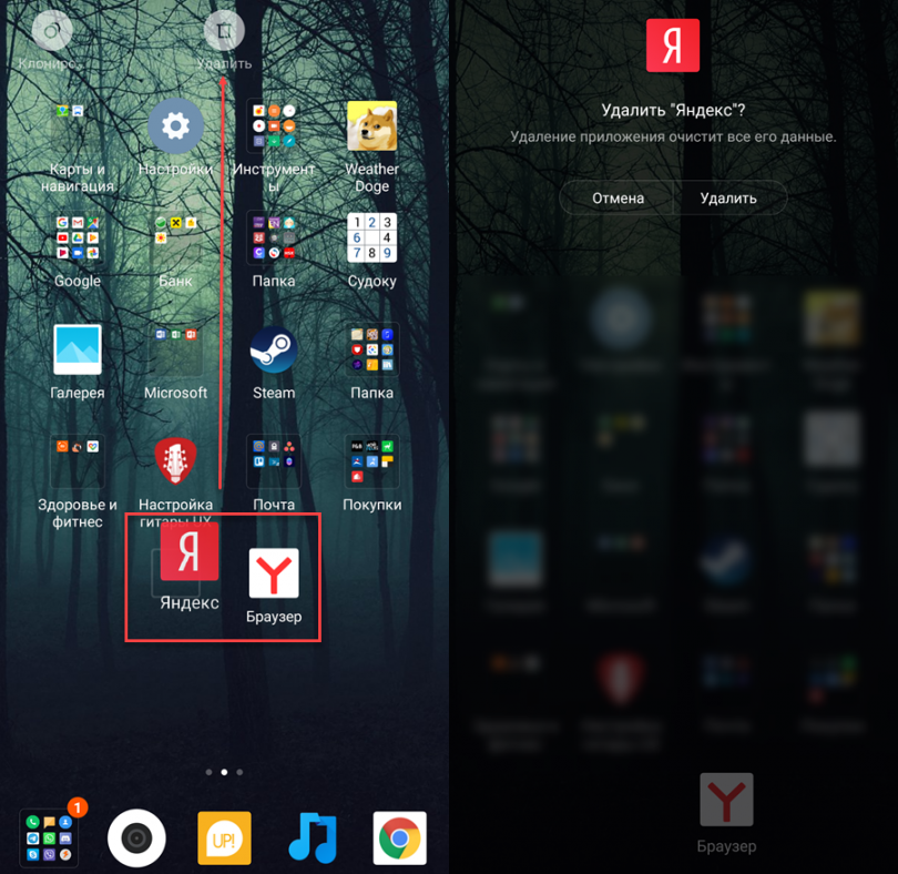 Повторите эту процедуру для других элементов Яндекса, после чего тапните по кнопке старта удаления, отмеченной на изображении ниже.