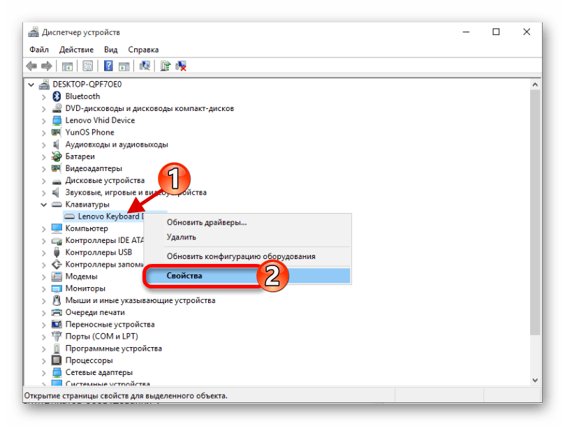 ОС не видит оборудование из-за того, что драйверы «слетают» в результате сбоев или некорректно устанавливаются при обновлении софта. Понадобится запустить «Диспетчер устройств» через «Панель управления» в меню «Пуск», найти в перечне пункт «Клавиатуры» и развернуть выпадающий список нажатием на стрелку слева от надписи. Затем выделить левым кликом строку с нужным устройством, а правым вызвать его контекстное меню, где выбрать «Свойства».