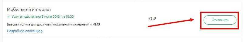 - В списке услуг без абонентской платы находим «Мобильный интернет» и отключаем: