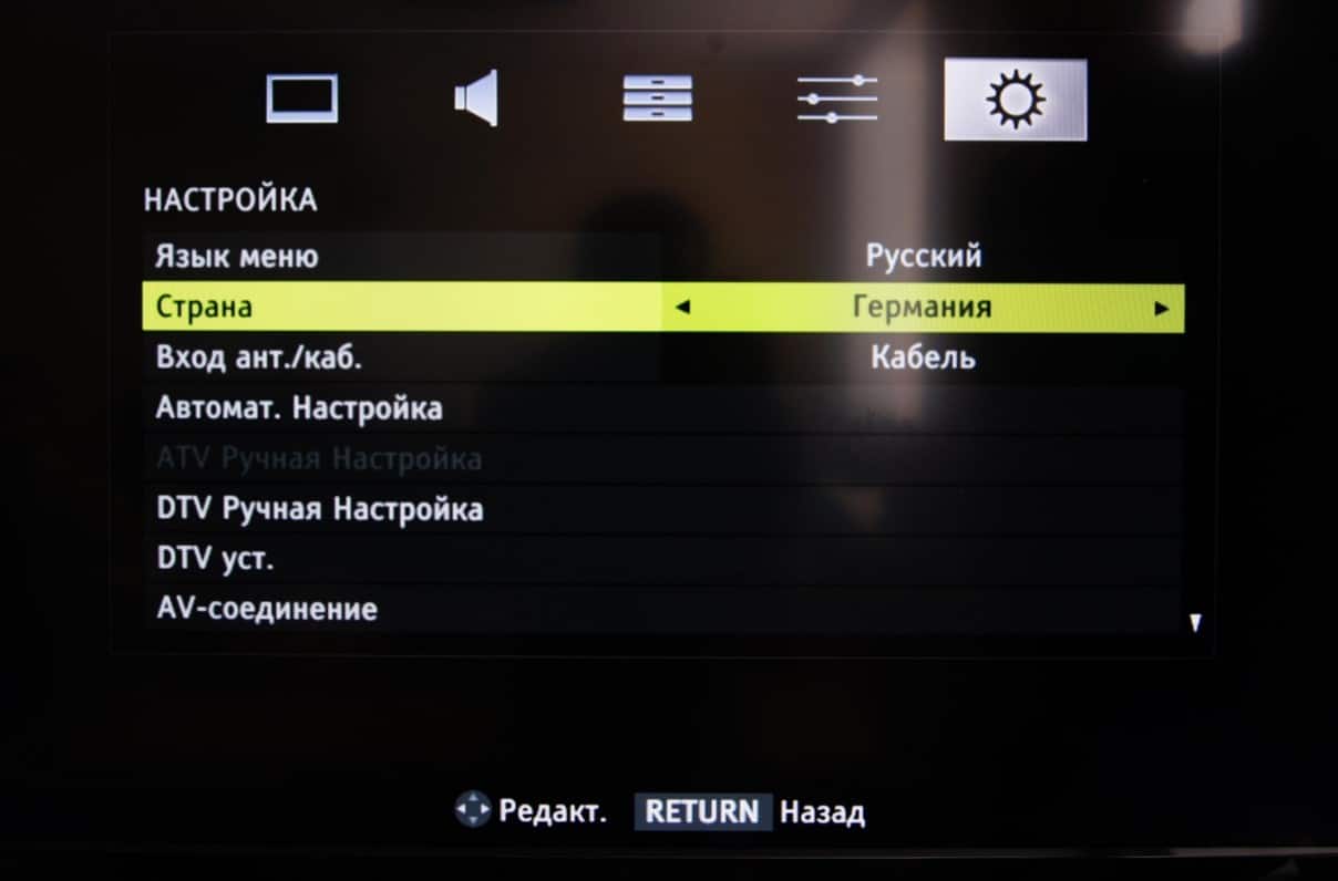 - Устанавливаем «Страну» на одну из европейских, предварительно выбрав «Кабель» в качестве источника сигнала.