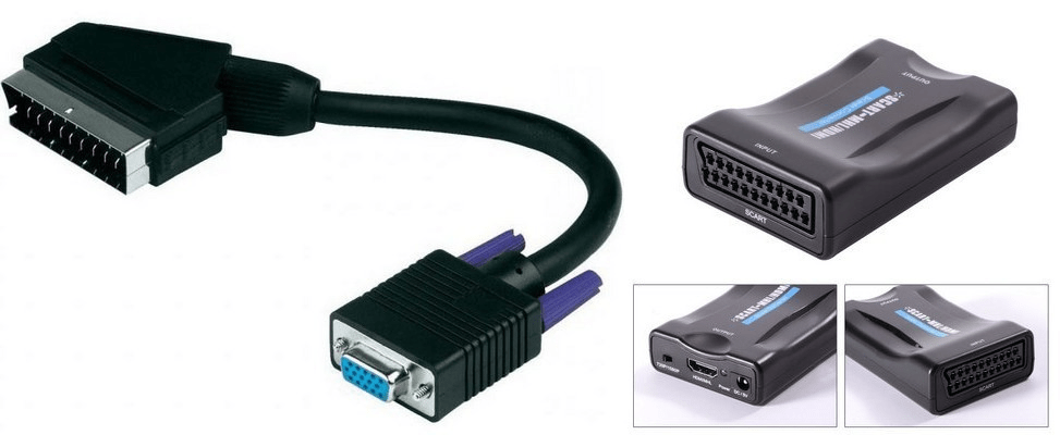 Это способ предусматривает использование переходника Scart → VGA или преобразователя сигнала (конвертора) Scart →HDMI. В первом случае штекер Scart подключают к ТВ приставке, а VGA штекер в порт монитора. Во втором случае к преобразователю подсоединяют два шнура HDM и Scart а другие концы этих кабелей подключают к устройствам.
