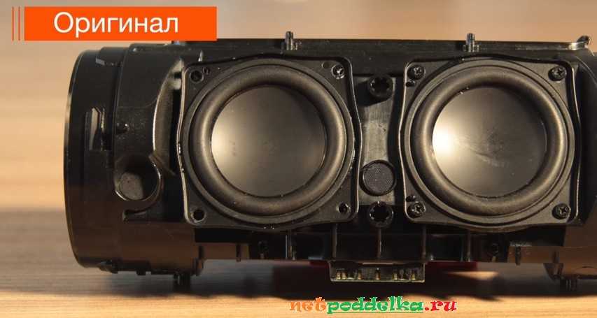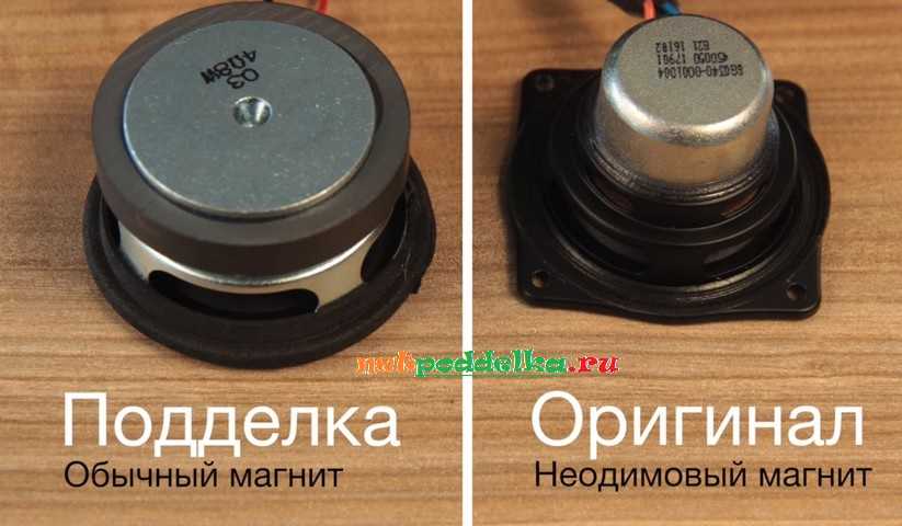 В подделке стоит неплохой ферритовый динамик на 4 Ом. Он обладает мощностью 8 Вт. В оригинале используется неодимовый магнит. Это позволяет сократить вес и размер динамика.
