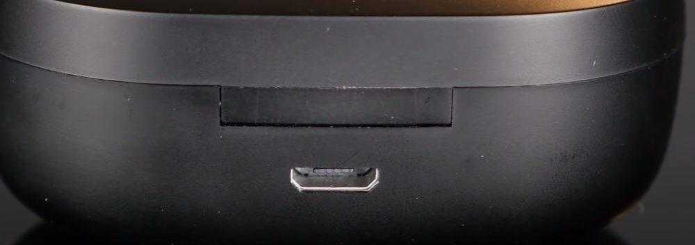 Поскольку бокс для хранения и зарядки наушником является и повербанком, кейс тоже нужно заряжать. Для этих целей служит стандартное гнездо microUSB. Подключаем кейс через этот разъём к источнику 5 вольт и заряжаем.
