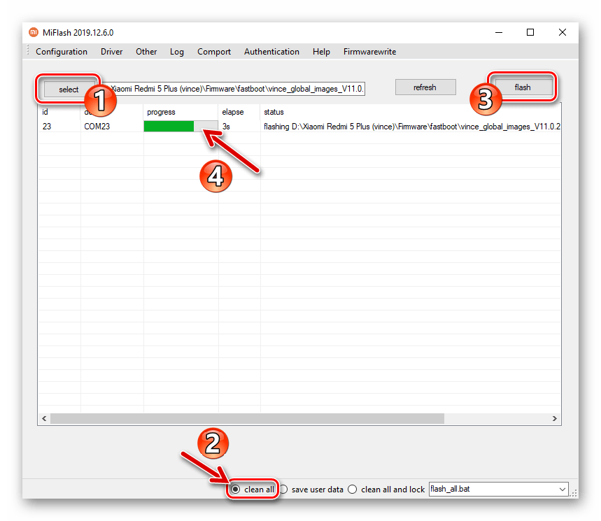 Самым популярным инструментом для переустановки системного ПО MIUI-устройств с ПК — Xiaomi MiFlash — процедура очистки памяти смартфона производится автоматически в процессе прошивки, если при настройке программы выбран один из следующих режимов ее непосредственной работы: «clean all», «clean all and lock».