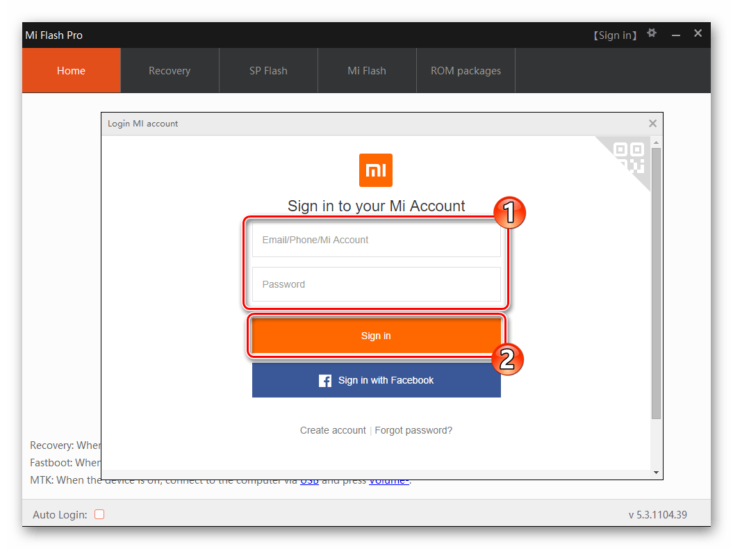 Запустите МиФлеш ПРО на ПК, введите в программу данные привязанного к смартфону Mi-аккаунта.