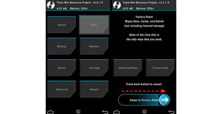 Чтобы сбросить телефон Xiaomi до заводских настроек, необходимо зайти в меню восстановления TWRP Recovery, выбрать «Wipe» и передвинуть ползунок в правой нижней части экрана в правую сторону. Управление в этом случае сенсорное, потому все движения можно делать касаниями. То есть без нажатия кнопок на боковой грани телефона как в ситуации с применением способа с Hard Reset.