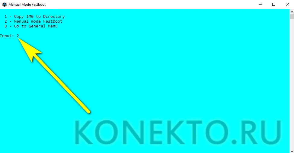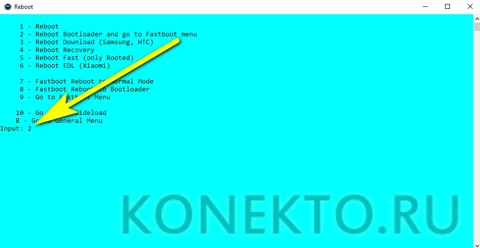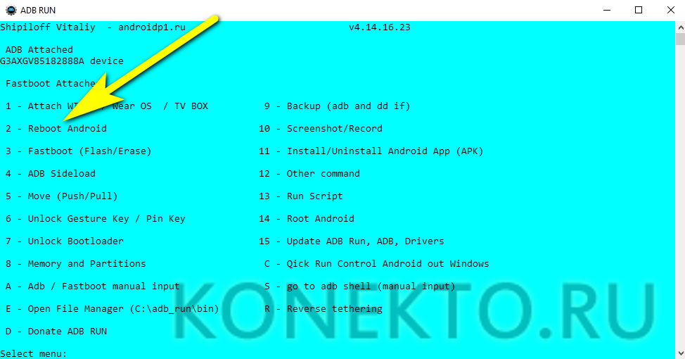 Подключить телефон, дождаться инициализации и запустить программу, затем — выбрать в списке доступных опций Reboot Android, введя в текстовой строке цифру 2 и нажав Enter.