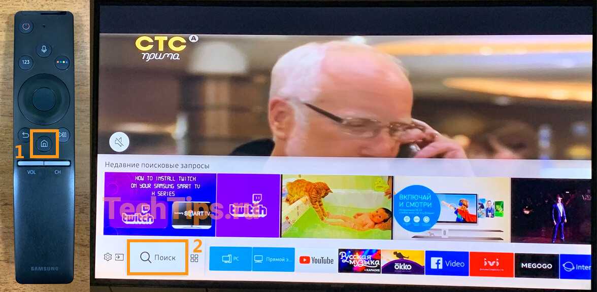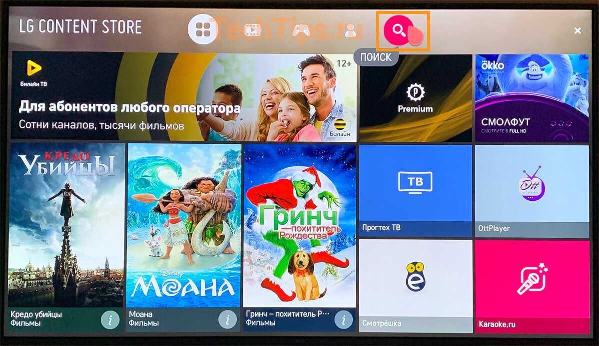Зайдите в меню, если у вас такой же пульт, нажмите на кнопку «Домик», откроется меню. Нажмите на «Поиск».