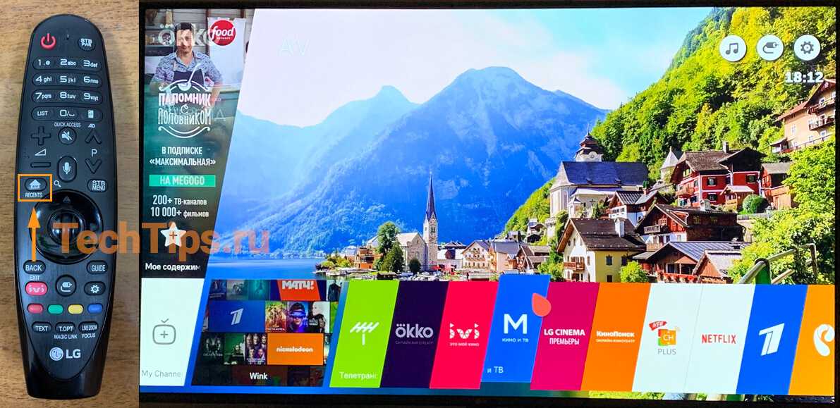 Зайдите в меню, если у вас такой же пульт, нажмите на кнопку «Домик, Recents», откроется меню.