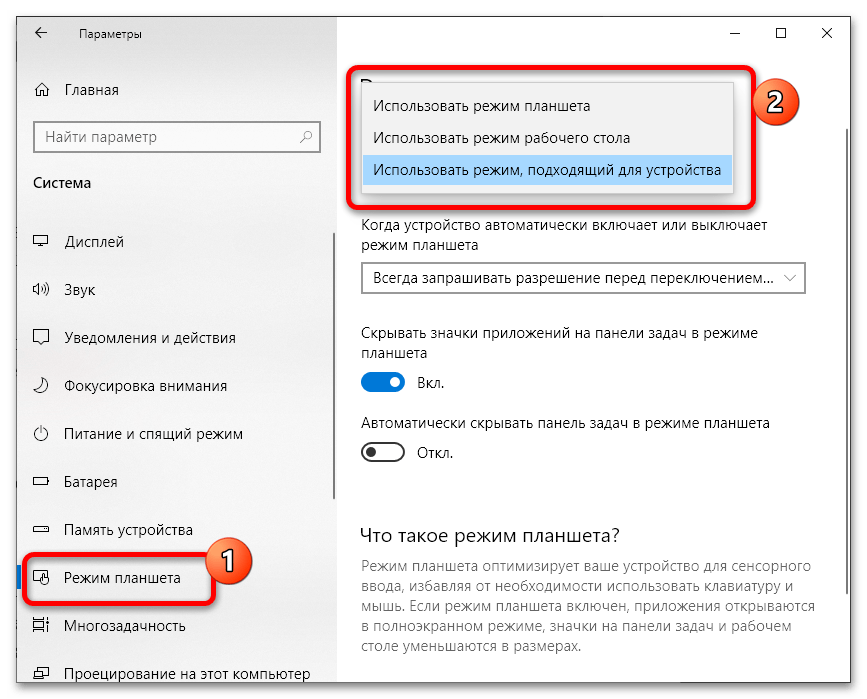 На заметку. В полной мере режим планшета работает только на ноутбуках, оснащенных сенсорным дисплеем.