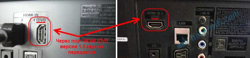Стоит отдельно отметить ситуацию с отсутствием звука, если подключение идёт через разъём HDMI (DVI) версии 1.3 (на устаревших моделях телевизоров). Чтобы аудио воспроизводилось, гнездо должно быть как минимум версии 1.4. Поддержки звука у варианта 1.3, к сожалению, нет. Если у вас есть другой порт на телевизоре, HDMI IN или HDMI (STB), установите связь через него.
