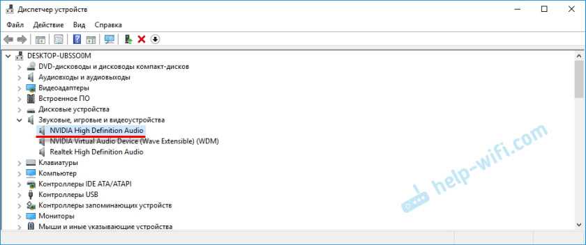Так же проверьте вкладку «Звуковые, игровые и видеоустройства». Там может быть адаптер «NVIDIA High Definition Audio», или AMD. Это уже зависит от установленной видеокарты.
