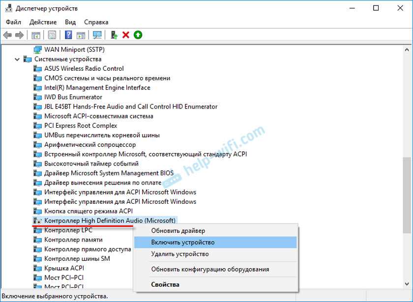 Поэтому, идем в диспетчер устройств, открываем вкладку «Системные устройства», находим там «Контроллер High Definition Audio (Microsoft)» и смотрим, нет ли возле него каких-то значков. Если есть, нажимаем правой кнопкой мыши и пробуем включить.