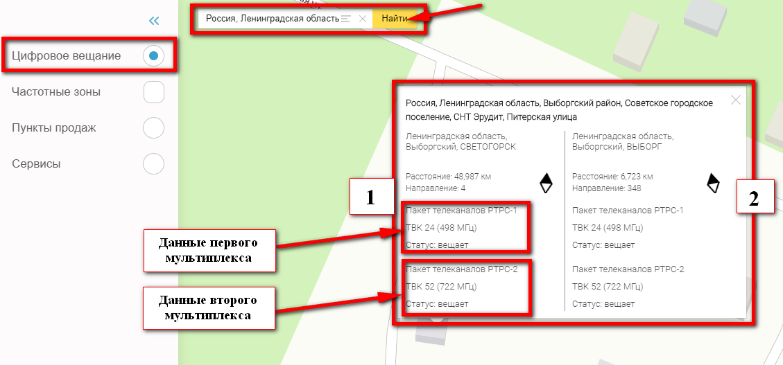 Аналогично можно зайти на картографический сервис РТРС. Поиском отыщите на карте свой дом или ближайший к нему. Кликните по дому и в информационном окне о ретрансляторе убедитесь, что статус «Вещает» напротив каждого мультиплекса.