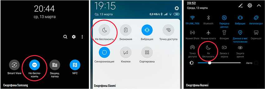 Для активации вышеупомянутого режима надо открыть шторку уведомлений, найти там соответствующий значок и нажать на него. Режим будет включен мгновенно. Отключить его можно таким же способом. Если требуемый значок по какой-либо причине отсутствует, то включить и выключить режим «Не беспокоить» можно будет через настройки телефона. Как это сделать, мы расскажем в следующих разделах. Инструкции для телефонов различных брендов чуть отличаются, потому мы рассмотрим самые популярные варианты, характерные для Android смартфонов Samsung, Xiaomi и Huawei. Также представим особенности настройки режима на таких аппаратах.