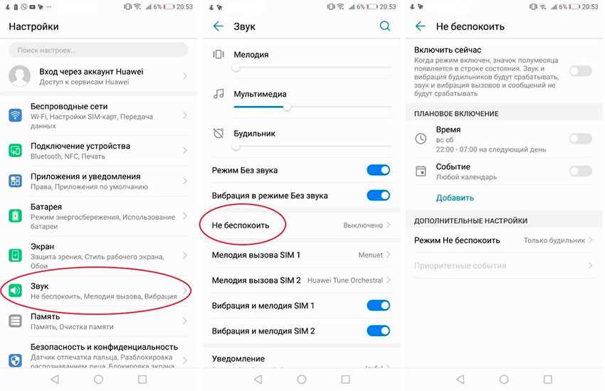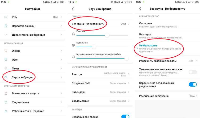 На смартфонах этого бренда активация режима осуществляется по схожему принципу, но имеет некоторые значимые отличия. Необходимо зайти в настройки девайса и перейти в раздел «Звук и вибрация». Далее понадобится найти строку «Не беспокоить», выбрать режим и указать желаемые настройки, активируемые при его включении. Процесс настройки предполагает рассмотрение ряда опций. Среди них: