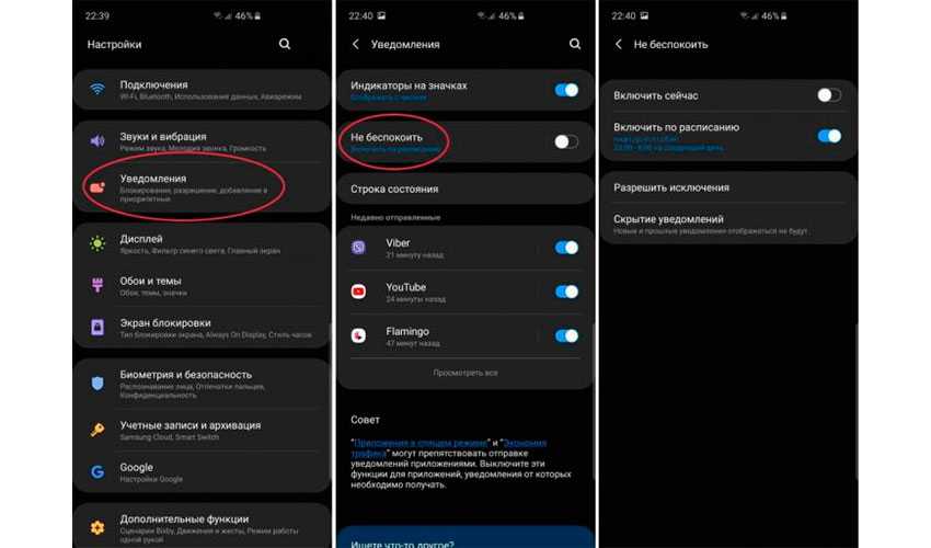 Чтобы включить режим «Не беспокоить» на Samsung, надо перейти по пути «Настройки – Уведомления», а затем переместить ползунок напротив пункта «Не беспокоить» в активное положение. Далее останется лишь решить – активировать функцию сейчас или настроить ее включение по расписанию. При выборе первого варианта опция будет активирована сразу. Во втором случае понадобится указать конкретные дни и время. После наступления заданного времени смартфон Samsung включит режим «Не беспокоить» автоматически.