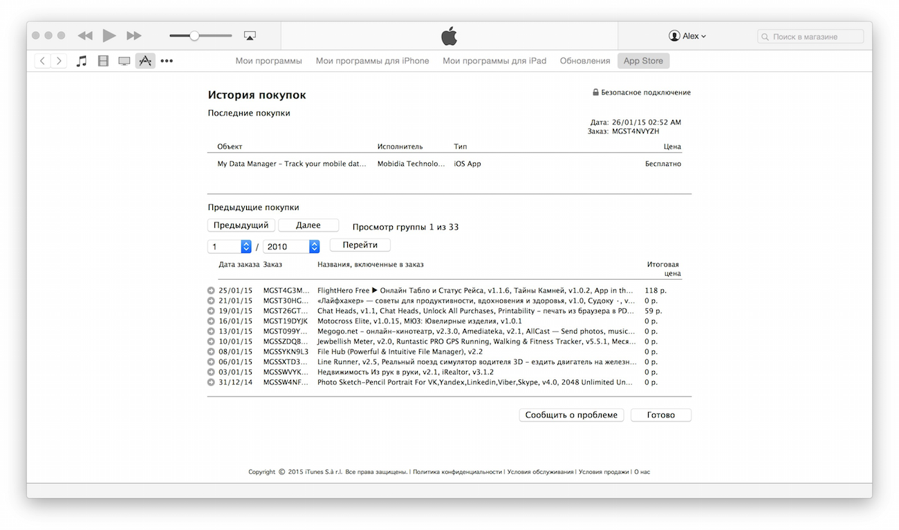 Вернуть деньги за приложение – это просто. Для этого вам придется потратить несколько минут своего времени и подождать ответа несколько рабочих дней. Первым делом устанавливаем iTunes на свой компьютер. Авторизуемся в программе с помощью тех же данных, которые вы использовали для авторизации в App Store на телефоне или планшете. Затем переходим в раздел «История покупок» и в самом низу страницы щелкаем на кнопку «Сообщить о проблеме».