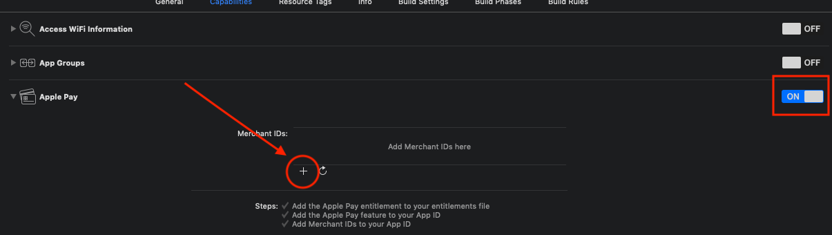 Сначала нам необходимо активировать Apple Pay в Capabilities Xcode и добавить, ранее созданный Merchant ID.