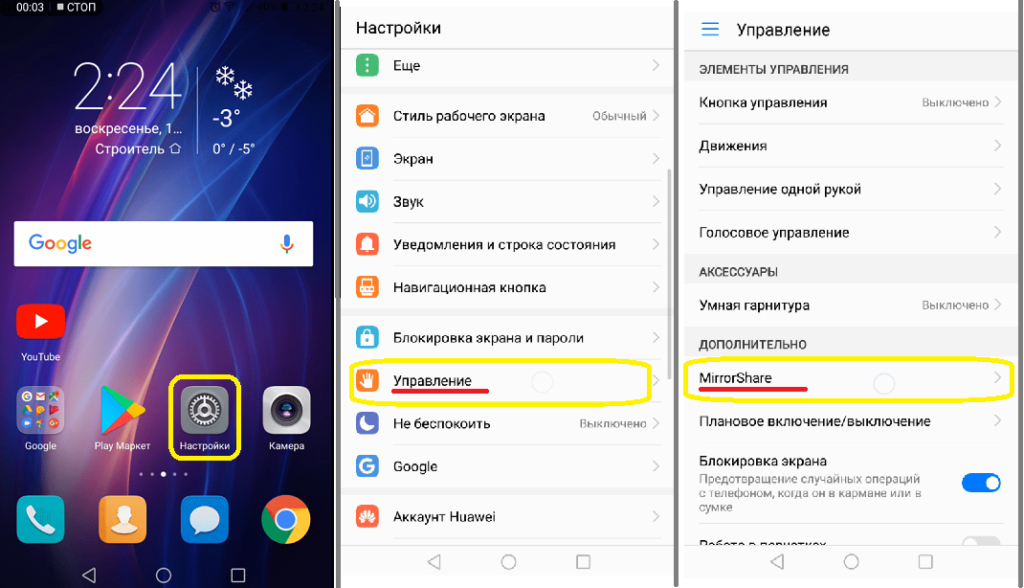 Нажимаем значок «Настройки», далее выбираем «Управление» затем »MirrorShare»