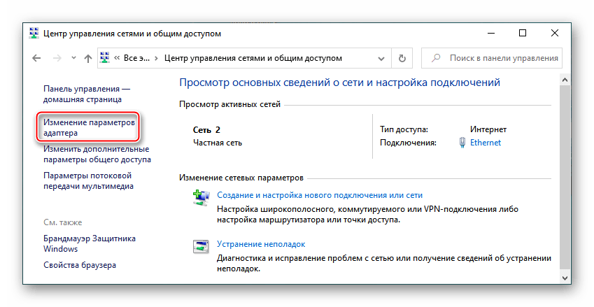- Кликните ЛКМ по надписи «Изменение параметров адаптера».