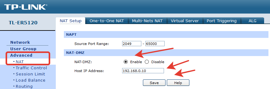 Для DMZ Переходим Advanced – DMZ. Вводим адрес компьютера для которого будет открыт полный доступ.