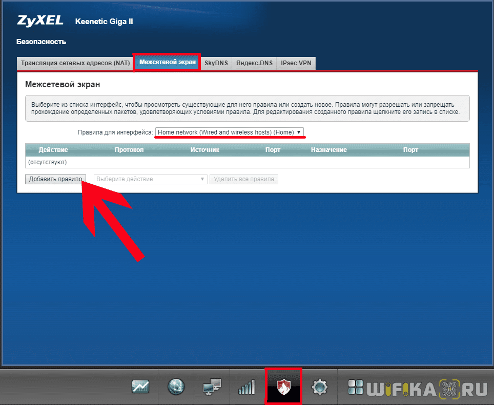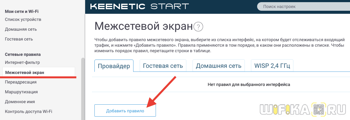 На обновленной линейке Keenetic DMZ настраивается тоже в рубрике «Межсетевой экран». Жмем тут «Добавить правило»