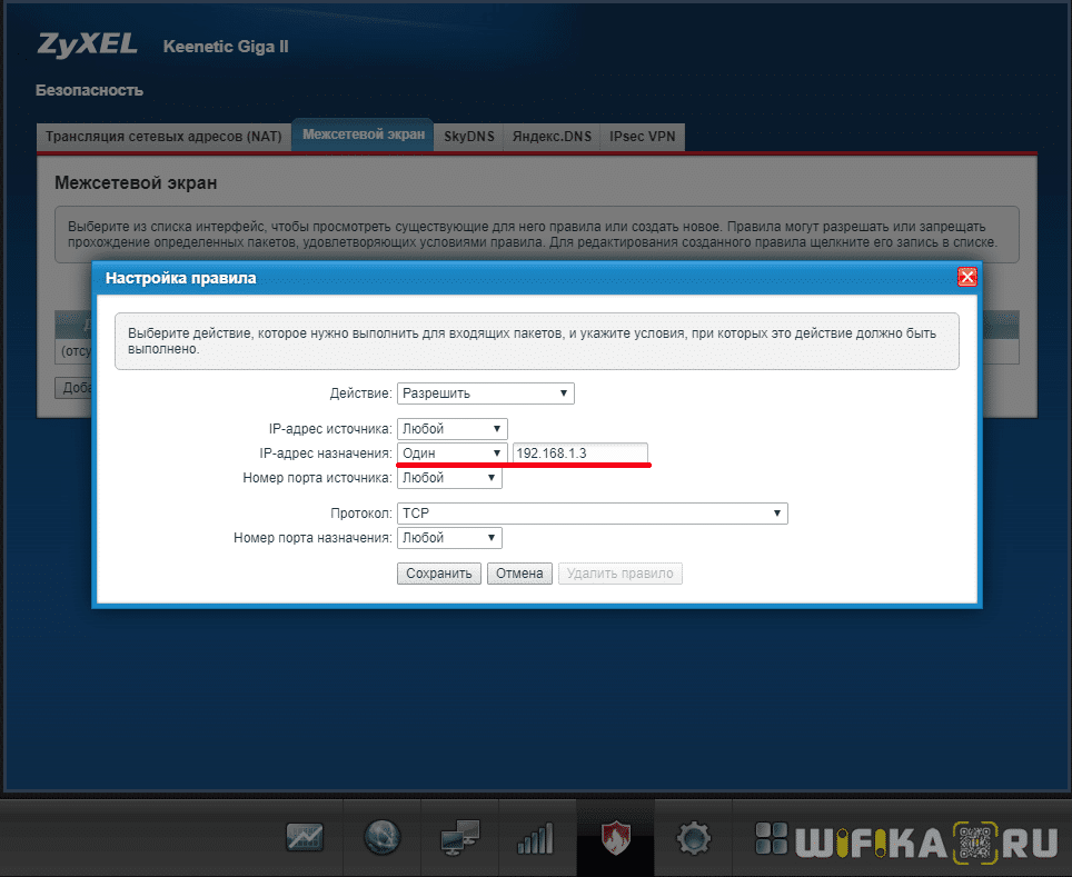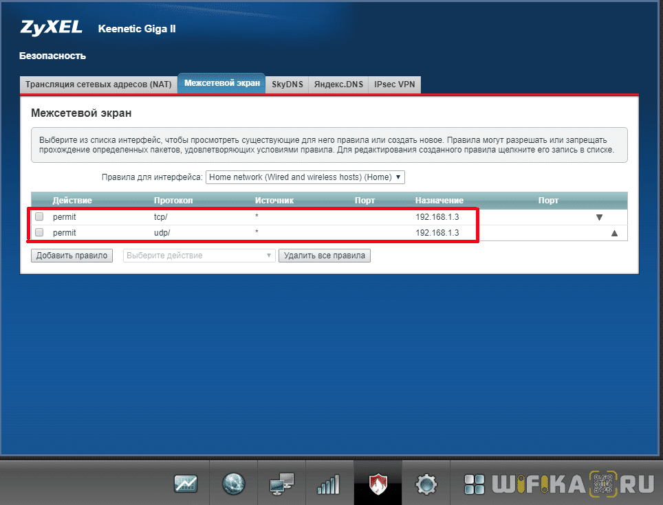 NOTE: Важно! Дополнительную настройку межсетевого экрана производить не нужно, т.к. при использовании правила переадресации интернет-центр самостоятельно открывает доступ по указанным портам и протоколам