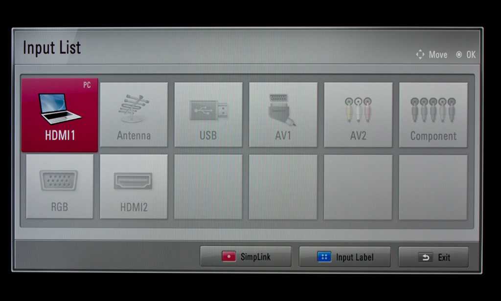 Ещё очень распространённый вариант это найти на пульте кнопку «SOURСE» она часто обозначается прямоугольником с направленной внутрь него стрелочкой. Нажимаем на эту кнопку и попадаем в меню выбора источников сигнала например такое.