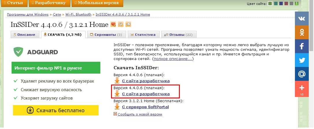 Чтобы найти свободный канал и изменить его, нужно использовать программные средства. Самый известный из них — inSSIDer. Приложение бесплатно только для домашней версии. Рекомендуется скачать его с сайта, а затем запустить. Условием работы программы является наличие wi-fi адаптера на рабочей станции. На ноутбуках он встроенный, а для ПК приобретается отдельно.